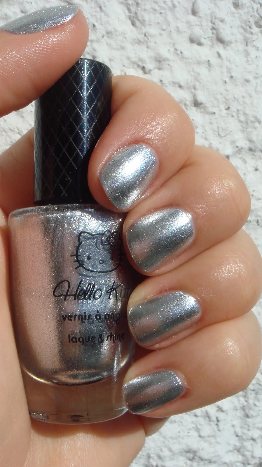 Anyway, until I go to the States, I have to pick polish in my actual stash (which can really use some new polishes but that's just my opinion...) so for today I've chosen a polish from Hello Kitty. This is Le Fric C'est Chic and it's a silver foil with what look to me like almost holo glitters.